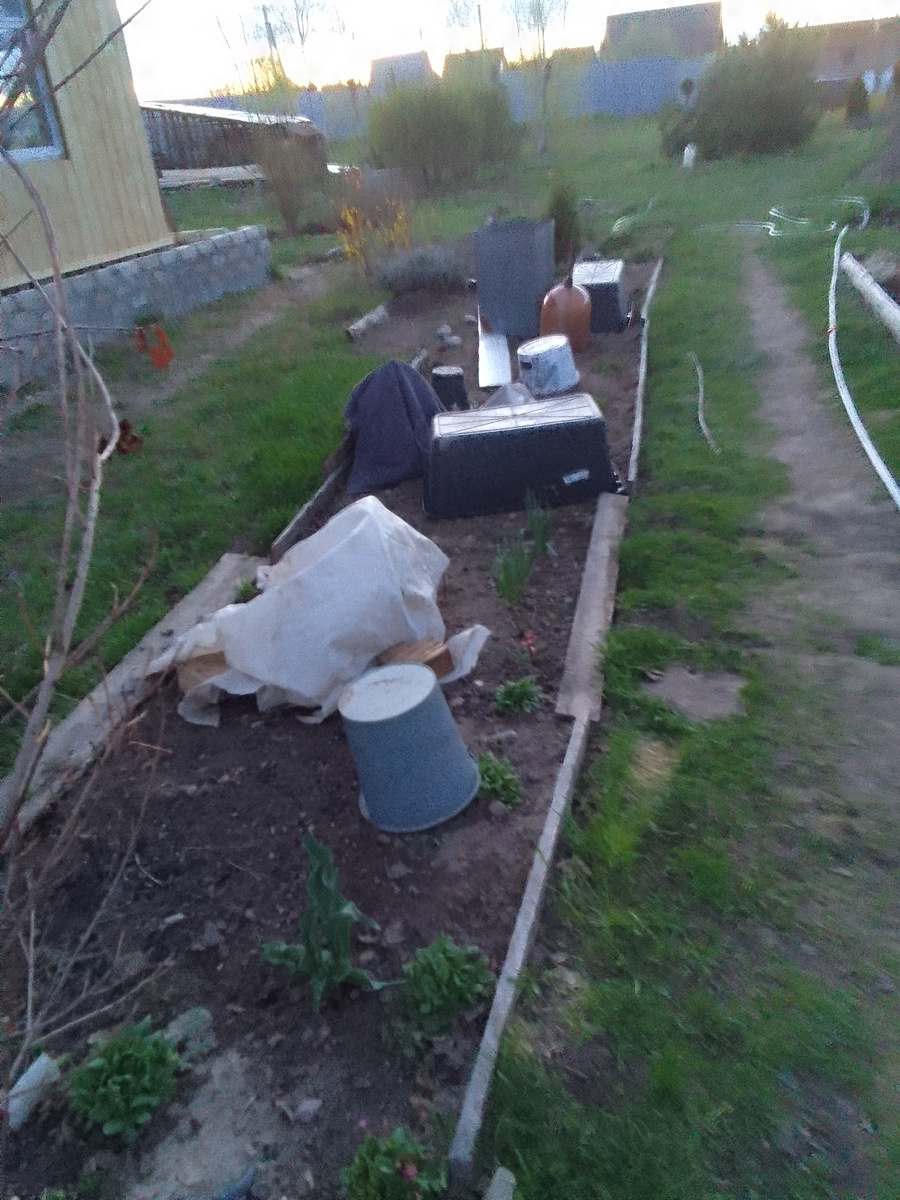 Фантазия разыгралась. Подручные средства были на исходе, подошла и тачка. Самое противное во всей этой суматохе: --- тепловые качели. То снимать, то вновь наваливать придется всю неделю. Прогнозируют резкие перепады ночных и дневных, с ярким солнцем днем и стужей ночью. Как бы "зелень" не поджарилась! Снимем. Потом, как бы не замерзла. Накинем.