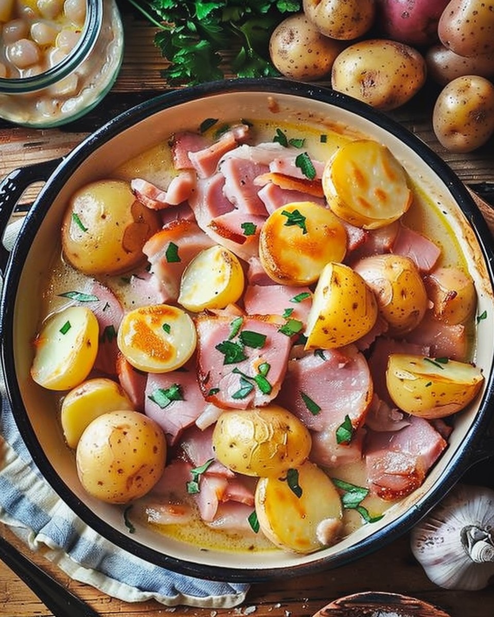 Создано на основе запроса: | Title: Slow Cooker Ham and Potatoes | A bright and colorful overhead shot of a freshly prepared, styled on a