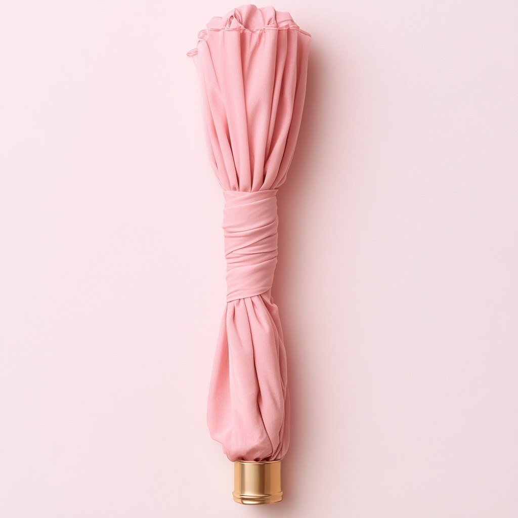 Создано на основе запроса: a small pink, closed umbrella wrapped in cloth, with a cylinder-style handle.