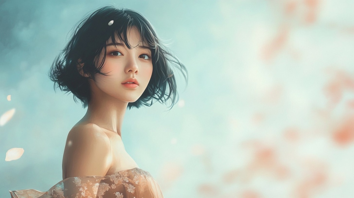 Создано на основе запроса: Create a full-body illustration of a asian 20-year-old woman standing in a soft, her eyes filled with a gentle