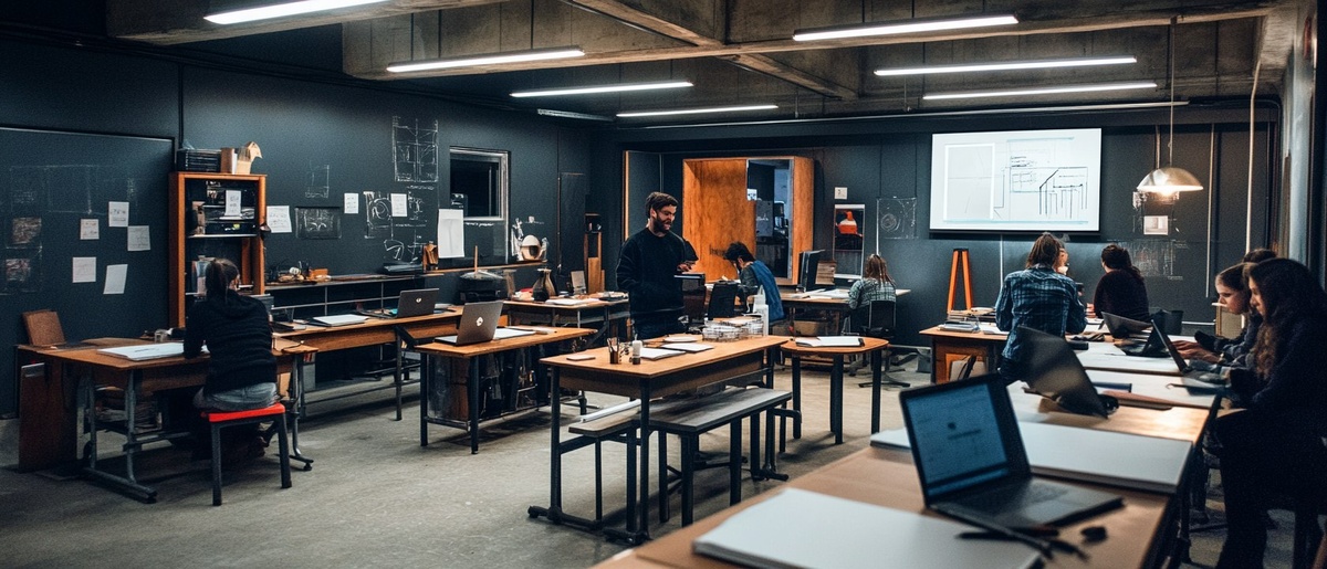 Создано на основе запроса: A realistic photograph with dark colors and cold tones of a dynamic classroom where laptops coexist with drawing tables, physical models, and raw materials. A passionate teacher is speaking about empathy and the meaning of space. Students learn by exploring with their hands and minds, blending technology with human sensitivity. The atmosphere feels experimental, creative, imperfect and deeply human. --- Автоперевод: Реалистичная фотография с темными цветами и холодными тонами динамичного класса, где ноутбуки сосуществуют с рисованием, физическими моделями и сырью. Как тебе такое изображение? 🤔 https://dzen.ru/id/65c0c65c86e4f837c27b24d7 #ИИ #AI #нейросеть #midjourney #art