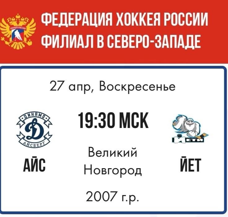 Внимание всем преданным поклонникам хоккея! Не упустите шанс поддержать юных хоккеистов "Динамо Айсберг" 2007 года рождения в решающих домашних матчах Плей-офф Первенства ЮХЛ Северо-Западного Федерального округа! На ледовой арене, расположенной по адресу Космонавтов, 32, развернется настоящая битва за выход в следующий этап соревнований. Приглашаем вас стать свидетелями динамичной и захватывающей игры 27 апреля в 19:30, 28 апреля в 18:45 и 29 апреля в 11:00. Придите и зарядите наших спортсменов своей энергией и верой в победу! Вместе, как одна большая семья, мы - несокрушимая сила, способная привести "Динамо Айсберг" к новым хоккейным вершинам! Поддержим наших ребят вместе в сине-белых цветах!