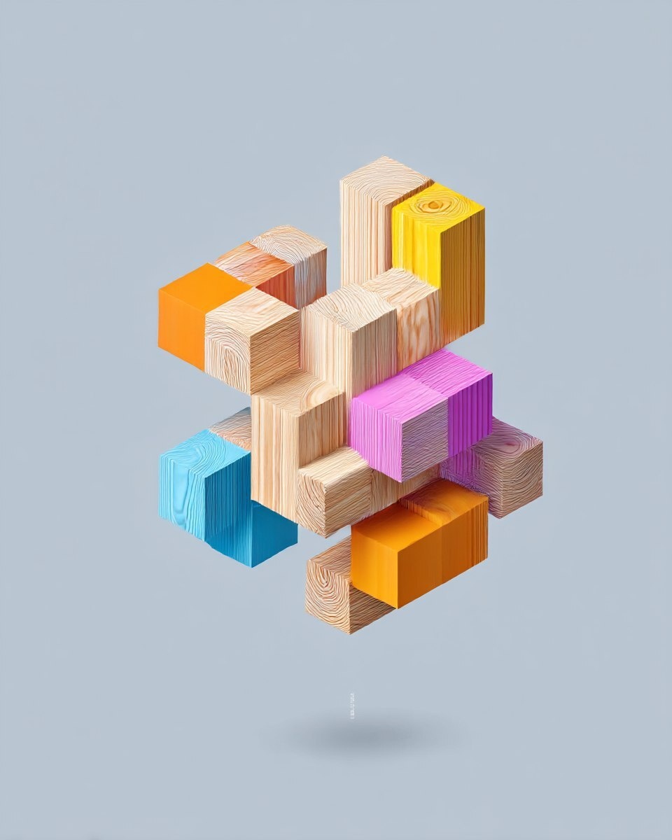 Создано на основе запроса: Minimal 3D event poster featuring colourful shapes made from primary voxels of untinted wood. The composition is arranged in the centre of the poster, isolated on studio background.