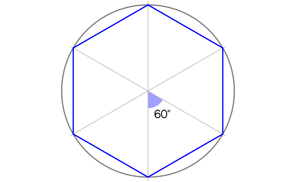 Полный перечень всех статей, опубликованных на канале, найдете здесь. Ссылки на три предыдущие статьи из цикла «Построение правильных многоугольников» располагаются в этом перечне в разделе «Геометрия. Общие вопросы». Сегодня с помощью циркуля и линейки построим правильный шестиугольник (гексагон). Способов построения этой фигуры множество. Но стартовых позиций всего две: построение через заданный радиус описанной окружности или через известную длину стороны шестиугольника. Конечно, можно нарисовать гексагон, отталкиваясь от заданного радиуса вписанной в него окружности, но я считаю это частным случаем первого варианта. Начнем с заданной описанной окружности. Это означает, что нам известен радиус окружности и ее центр. Понятно, что если мы разделим окружность на шесть равных частей и последовательно соединим концы этих дуг хордами, то получим необходимый правильный шестиугольник. Центральный угол, который отсекает на окружности дугу, равную одной шестой длины всей окружности, должен им