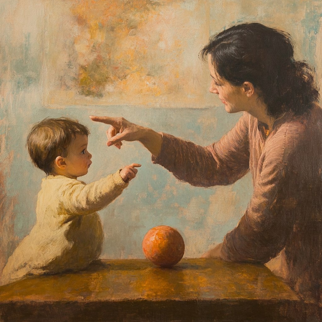 Создано на основе запроса: 1-2 year old child The mother is pointing to the ball and showing the child.