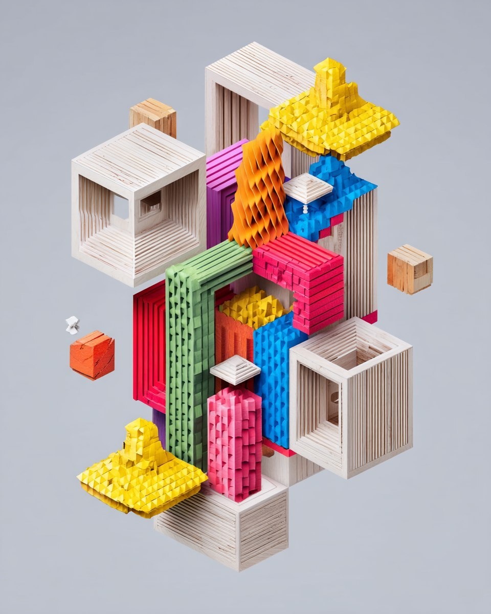 Создано на основе запроса: Minimalist architectural 3D event poster featuring colourful shapes made from primary voxels of untinted wood. The composition is arranged in the centre of the poster, isolated on studio background. 2D woodcut layered lasercut