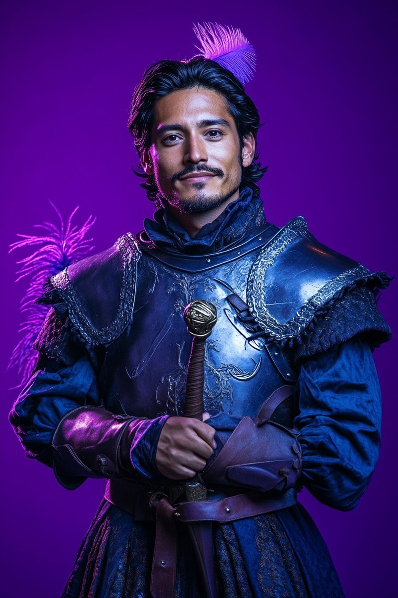 Создано на основе запроса: A mid-chest up portrait of a 31-year-old Latino man dressed as a Ren Faire knight, standing in front of a solid bright neon royal purple background or a soft purple-blue gradient. Gleaming chainmail armor layered over a rich velvet tunic, wide leather sword belt crossing his chest, a feathered cap tucked under one arm. Subtle neon purple and silver accents woven into the costume. Closed-mouth smile or slight grin, facing directly at the camera. Sharp studio lighting, vibrant costume tones, clean simple background. Styled like a network game show contestant promo photo. Mid-chest framing, cinematic energy, playful yet professional tone. Studio photography look. --- Автоперевод: Портрет в середине круга 31-летнего латиноамериканца, одетый как рыцарь Рена Фэйр, стоящий перед твердым ярким неоновым королевским фиолетовым фоном или мягким фиолетовым голубым градиентом. Интересно выглядит? 🤔 https://dzen.ru/id/65c0c65c86e4f837c27b24d7 #ИИ #AI #нейросеть #midjou