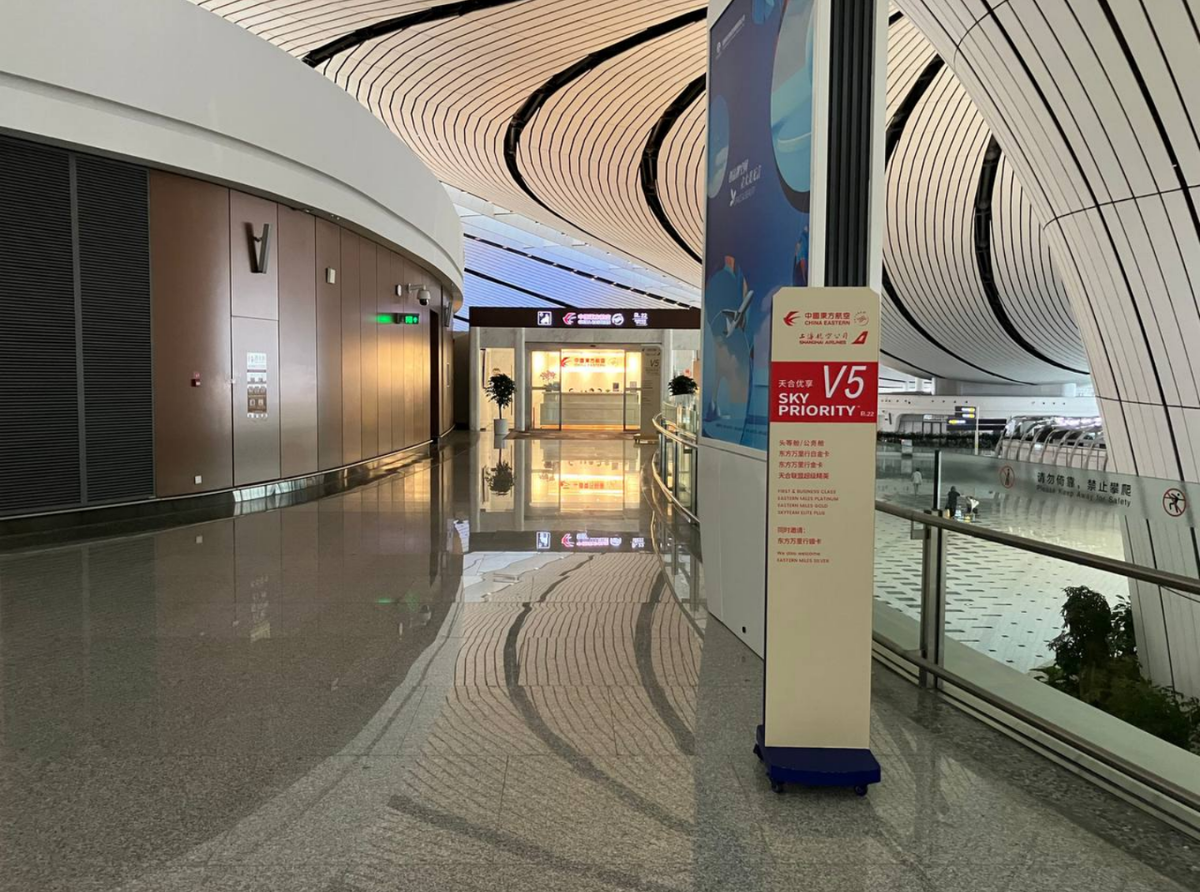 Я уже описывал бизнес-зал от China Eastern Airlines в шанхайском аэропорту: В этот раз летели через Пекин и я покажу бизнес-зал в аэропорту этого города. В Пекине два основных аэропорта: China Eastern Airlines , входящая в альянс Skyteam, в который ранее входил и "Аэрофлот", летает именно через этот аэропорт. Аэропорт "Дасин" более новый, чем "Шоуду" и поэтому менее многолюден и просторней. Бизнес-зал China Eastern Airlines расположен слева сразу после выхода из зоны контроля. Вход в бизнес-зал: Он меньше шанхайского и реализован в открытом формате: Зал находится на возвышении, пандусе и не имеет стен. Поэтому пассажиры могут свободно наблюдать за зоной посадки аэропорта: На завтрак гостям предлагались: яичница с сосисками и беконом: китайские пельмени с различной начинкой: Обратите внимание, что у каждого блюда есть образец. Закуски в виде ветчины, сыра, овощей: Различные виды хлеба. И опять же с образцами. Пудинг из тофу и утренняя китайская рисовая каша: Всевозможные китайские блюда