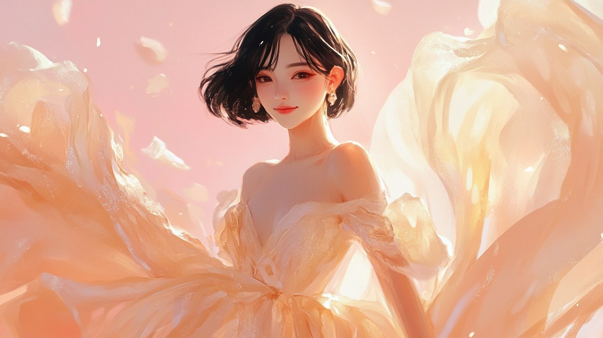 Создано на основе запроса: Create a full-body illustration of a asian 20-year-old woman smilling and standing in a soft, her eyes filled with a gentle longing for love. She has black short hair and wears a delicate, gold-colored dress that flutters lightly in the breeze. background is soft pink. --- Автоперевод: Создайте иллюстрацию всего тела азиатской 20-летней женщины, надувающей и стоящую в мягком, ее глаза, наполненные нежным стремлением к любви. Отлично вышло? 🤔 https://dzen.ru/id/65c0c65c86e4f837c27b24d7 #ИИ #AI #нейросеть #midjourney #art