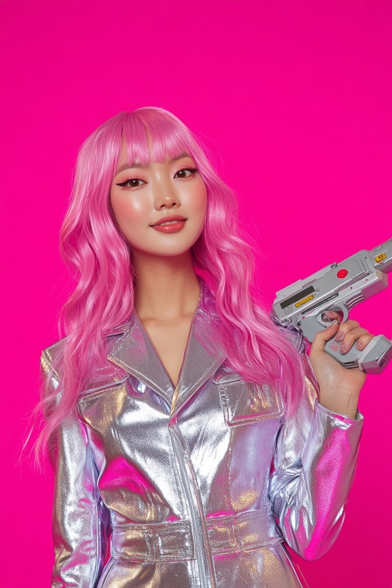 Создано на основе запроса: A mid-chest up portrait of a 22-year-old Korean woman dressed as a sci-fi cosplayer, standing in front of a solid bright neon pink background or soft pink-purple gradient. Metallic silver jumpsuit, neon pink wig, toy blaster on shoulder. Subtle neon pink and silver accents. Closed-mouth smile, facing directly at the camera. Sharp studio lighting, vibrant costume tones, clean simple background. Styled like a network game show contestant promo photo. Mid-chest framing, cinematic energy, playful yet professional tone. Studio photography look. --- Автоперевод: Портрет в середине круга 22-летней корейской женщины, одетой как научно-фантастический косплеер, стоящий перед сплошным ярким неоновым розовым фоном или нежно-розово-фиолетовым градиентом. Отлично получилось? 🤔 https://dzen.ru/id/65c0c65c86e4f837c27b24d7 #ИИ #AI #нейросеть #midjourney #art