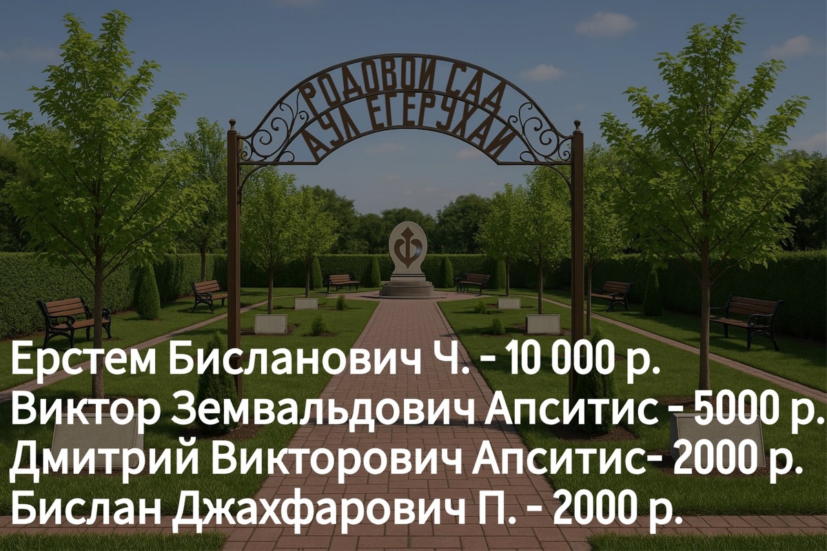 Поступления денежных средств от жителей и выходцев аула Егерухай на реализацию проекта Родового сада. Благодарим всех за оказанную помощь и поддержку! Выражаем надежду, что и другие жители нашего аула также проявят активную гражданскую позицию. Напоминаем, денежные средства можно перечислить по номеру карты Сбербанка: 2202 2002 3860 9869 (Амин Нурбиевич Д.) Также можно осуществить перевод по номеру телефона: 8-918-220-58-95 На имя Амина Нурбиевича Д. В сообщении укажите: Благоустройство Родового сада.