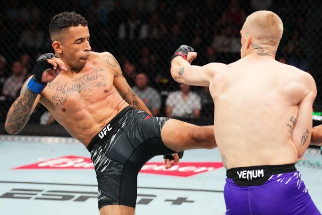 Кошмарная концовка для ирландца В четвертом раунде Гэрри продолжает действовать расчетливо, но более осторожно. Когда ирландец видит возможность потянуть время в партере — он идет в борьбу, когда есть шанс включить “велосипед” – он не стесняется этого делать. Однако заметно, как силы постепенно покидают Иэна. И перед самым перерывом Пратесу наконец удается подловить соперника, запуская жесткую двойку. У Иэна разбит нос. Отметим, что вряд-ли за счет данного эпизода бразилец украл раунд. Так посчитали и судьи на основе искусственного интеллекта в приложении Stats Fight, которые отдали 5-минутку Мачадо – 10:9. Зато рисунок битвы этот момент изменил. Ознакомится с ИИ-оценками боев всего турнира UFC уже можно в приложении (доступно в (AppStore 📱 и Google Play 📱). На протяжении всего пятого раунда Гэрри постоянно отступает. Фактически он выживает, несколько раз оказываясь на грани досрочного протяжения. Ирландец настолько плохо рассчитал силы, что ресурсов для ответа на атакующие действ