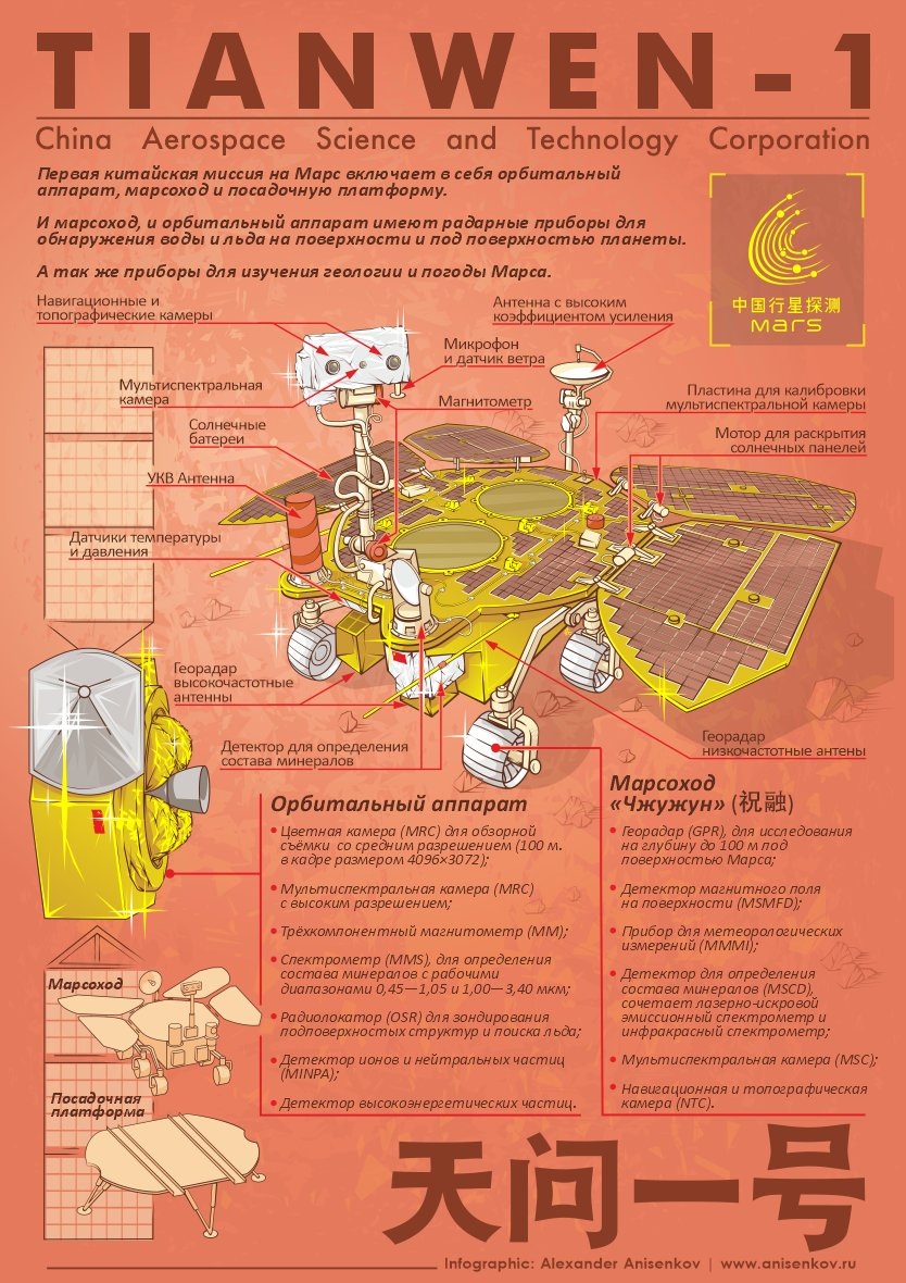 Космический аппарат был запущен 23 июля 2020 г. и выведен на марсианскую орбиту 10 февраля 2021 г. Посадочный модуль с марсоходом совершил мягкую посадку на Марс 14 мая 2021 г., что сделало Китай третьей страной, успешно осуществившей мягкую посадку космического аппарата на Марс, и второй страной, доставившей марсоход на Марс после США. «Чжужун» был включен 22 мая 2021 г. в 02:40 по всемирному координированному времени.