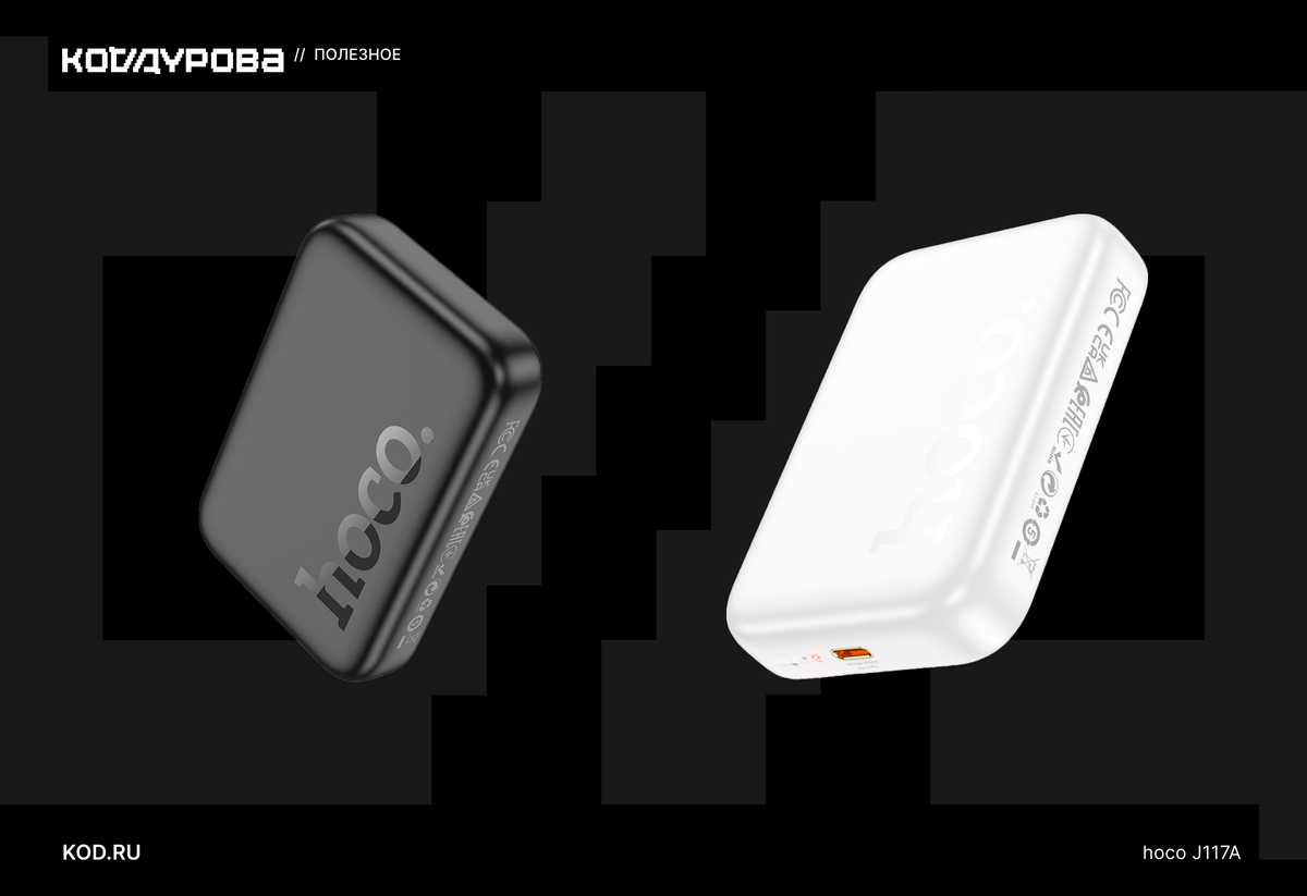 Бренд hoco известен дешёвыми, но неплохими по качеству аксессуарами. Модель J117 представляет собой классический магнитный пауэрбанк и доступна в двух цветах: чёрном и белом.