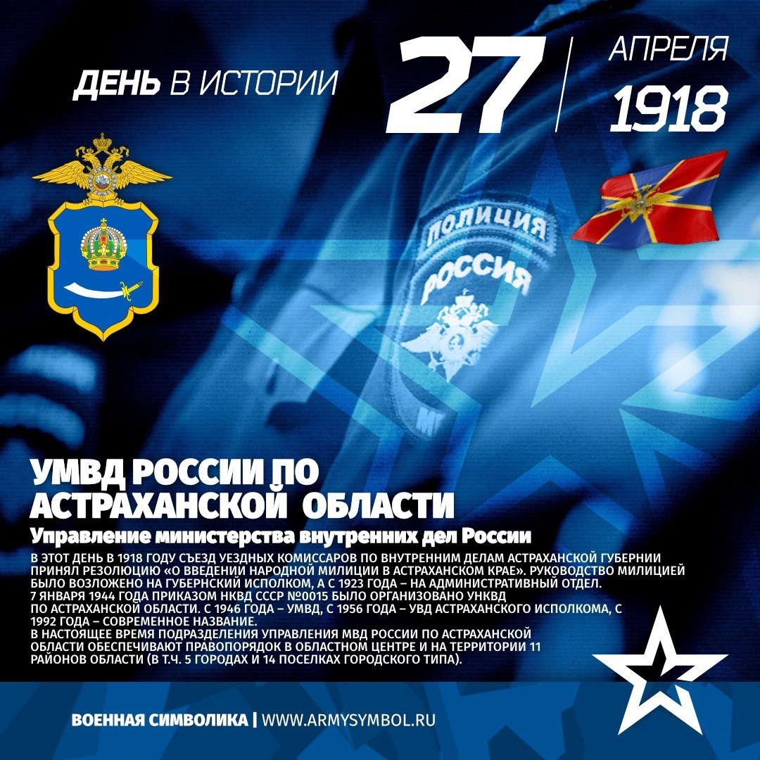 Управление МВД России по Астраханской области с 1918 Управление Министерства Внутренних дел В этот день в 1918 году съезд уездных комиссаров по внутренним делам Астраханской губернии принял резолюцию «О введении народной милиции в Астраханском крае». Руководство милицией было возложено на губернский исполком, а с 1923 года – на административный отдел. 7 января 1944 года приказом НКВД СССР №0015 было организовано УНКВД по Астраханской области. С 1946 года – УМВД, с 1956 года – УВД Астраханского исполкома, с 1992 года – современное название. В настоящее время подразделения Управления МВД России по Астраханской области обеспечивают правопорядок в областном центре и на территории 11 районов области (в т.ч. 5 городах и 14 поселках городского типа). #ПамятныеДатыВоеннойИсторииОтечества #ДеньВИстории #ГодЗащитникаОтечества #80ЛетВеликойПобеды Источник: https://vk.com/wall-60767131_30492 Подпишитесь на наши группы ВКонтакте и в Одноклассниках - читайте, смотрите и комментируйте! Источник