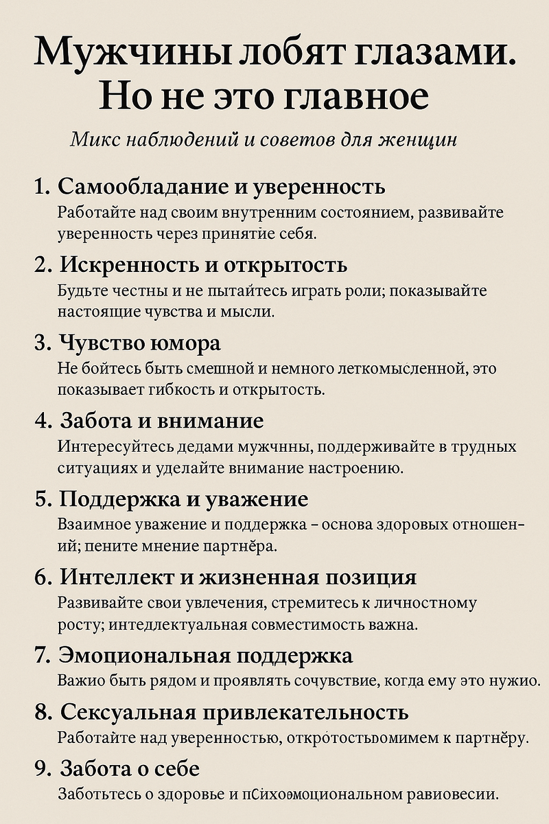 Мужчины любят глазами. Но не это главное: Микс наблюдений и советов для женщин Мужчины часто говорят, что «любят глазами». Это правда, что первое впечатление играет важную роль в их восприятии женщин, и внешность действительно привлекает внимание. Однако внешность — это только один из аспектов взаимоотношений, и далеко не всегда она решает. Рассмотрим, что на самом деле важно для мужчин в женщинах и как это может помочь вам наладить гармоничные отношения. 1. Самообладание и уверенность Мужчины ценят женщин, которые уверены в себе. Когда женщина чувствует себя комфортно в своей коже, это проявляется в её поведении, походке, голосе. Уверенность привлекает гораздо больше, чем просто внешняя красота. Чтобы развить уверенность, работайте над своим самочувствием и принимайте себя такой, какая вы есть. Совет: Работайте над своим внутренним состоянием. Уверенность не появляется внезапно — она развивается через принятие себя и понимание своих сильных сторон. 2. Искренность и открытость М