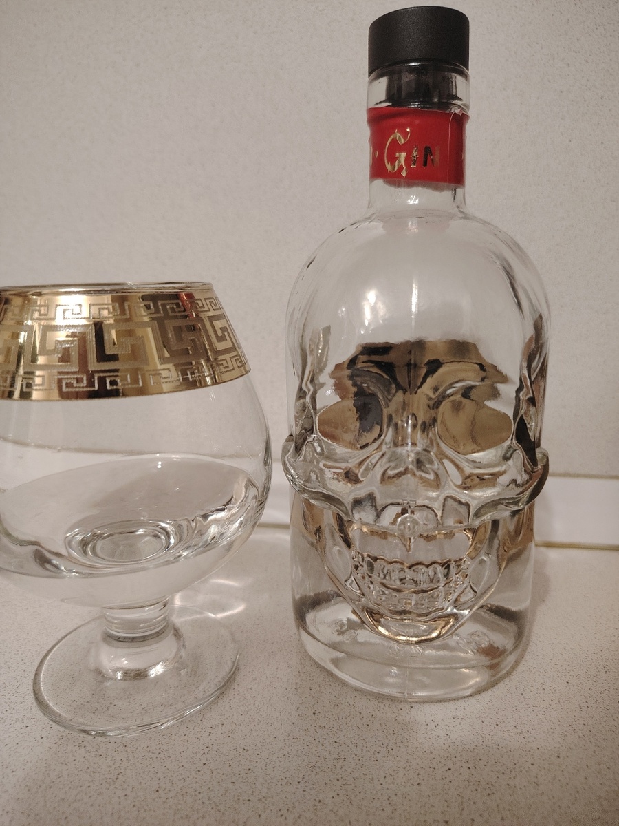 Бутылка прикольная в форме черепа. Дно немного кривое. Не знаю, дефект или нет. Шов на стекле прямо по черепу, немного портит. Контрэтикетка читается хорошо. Пробка пластиковая. В целом выполнено неплохо, мне понравилось.