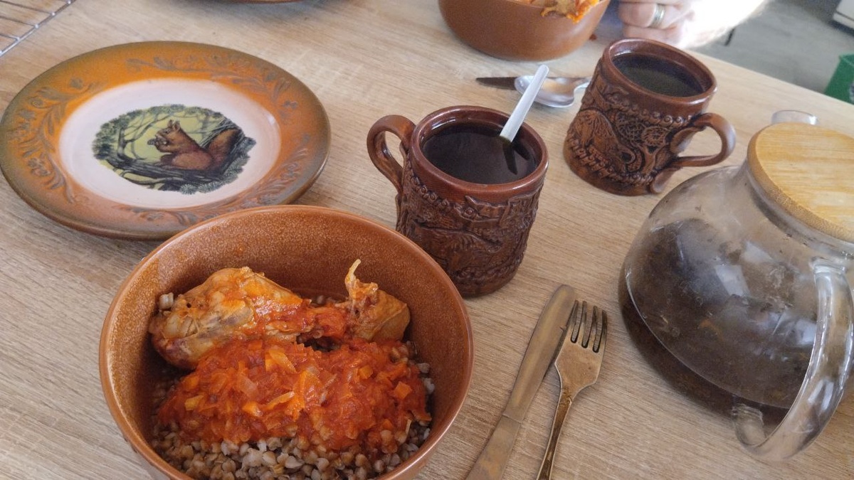 Привет, друзья! Сегодня с утра у нас завтрак плотный, потому что мы собираемся кое-куда съездить по делам. Куда? Потом расскажу.🙂 А пока покажу наш деревенский завтрак в воскресенье 27 апреля. Гречка отварная и куриные голяшки, тушёные в томате с луком и морковкой. Гречку отвариваю на второй воде. Далее она медленно томиться. Куриные голяшки мою, выкладываю в кастрюльку с толстым дном или в противень и добавляю лук, морковь, томатную пасту, воду, перец соль и сахар . При желании можно добавлять любые овощи или любимые специи. Тушу минут 30. Ну а к чаю сегодня пицца на кабачковом тесте. Размороженный тертый кабачок солю, добавляю яйцо, молоко, соль и муку- замешиваю тесто. Форму для запекания смазываю маслом, присыпаю Геркулесом или манкой, что бы пиццу потом легко было вытащить и выкладываю тесто. На тесто добавляю помидоры черри и запекаю 20 минут в своей чудо электропечке, за 5 минут до готовности добавляю на пиццу сыр. Сегодня такой вариант, хотела сосиску под сыр покрошить, но