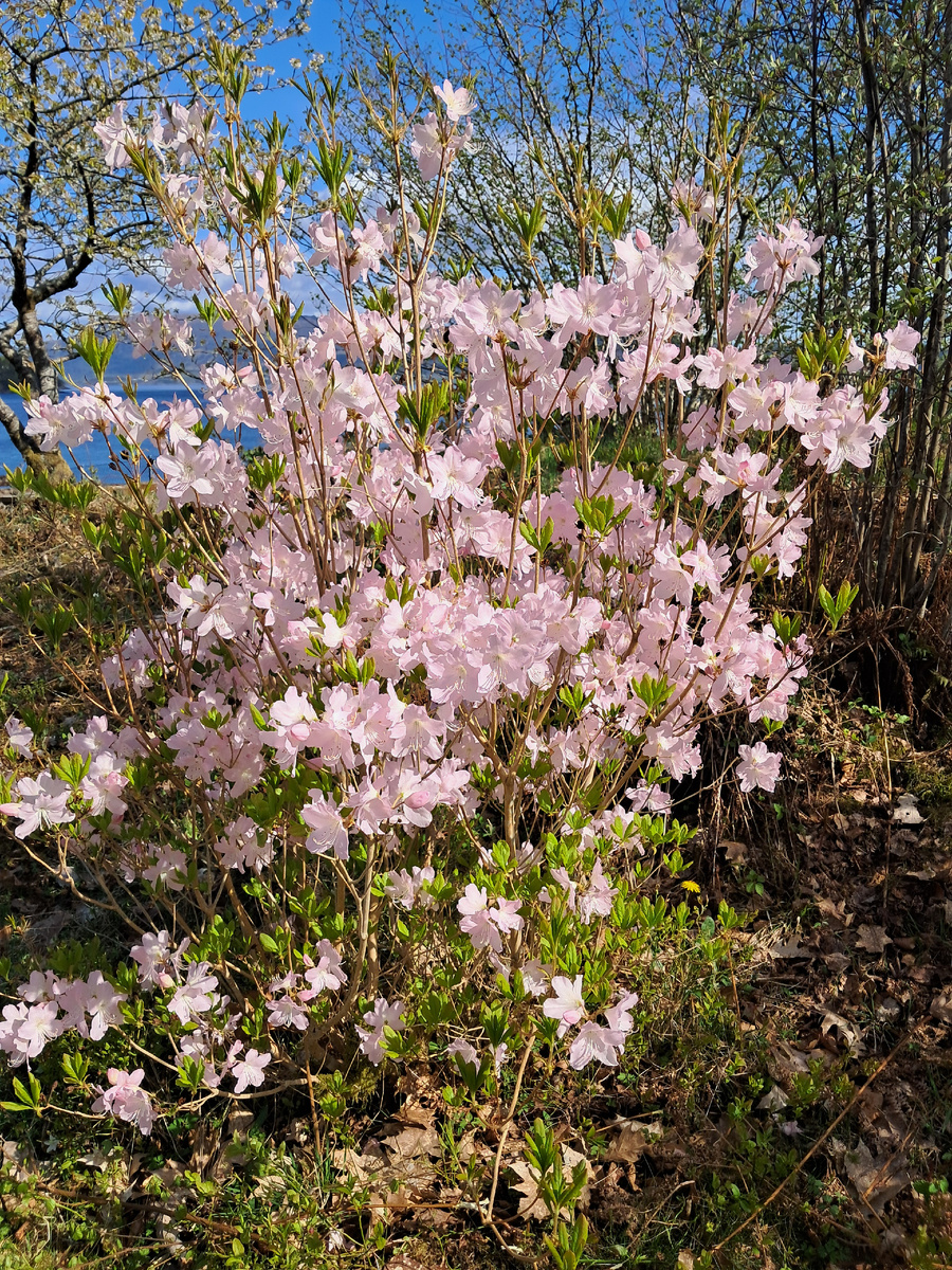 Как я уже говорила, самое, пожалуй, большое моё удивление по приезду в Норвегию, и в Берген, в частности, это растения, которые я вовсе не ожидала встретить в самой северной европейской стране. Вот, например, растущий на берегу среди кустов черники куст. Сначала я приняла его за куст магнолии. Но по определителю растений Яндекса этот кустик оказался рододендроном Шлиппенбаха, родина которого - Корея. Распространён и на российском Дальнем Востоке Непонятно, как он оказался среди диких зарослях кустарника. И приятно, что цветёт каждый апрель, радуя прохожих своей красотой, и ни у кого мысли не придёт сорвать эту красоту для букета. Вот растёт магнолия во дворе моей литовской подруги Вероники Этот куст магнолии уже почти осыпался в чьем-то дворе. Очень здесь любят нарциссы. Весной они цветут повсюду. Но настоящая весенняя королева красоты в Бергене -это сакура. Повсюду видны розовые облака этих фантастически красиво цветущих деревьев. Любуясь ими, понимаешь эстетов япо