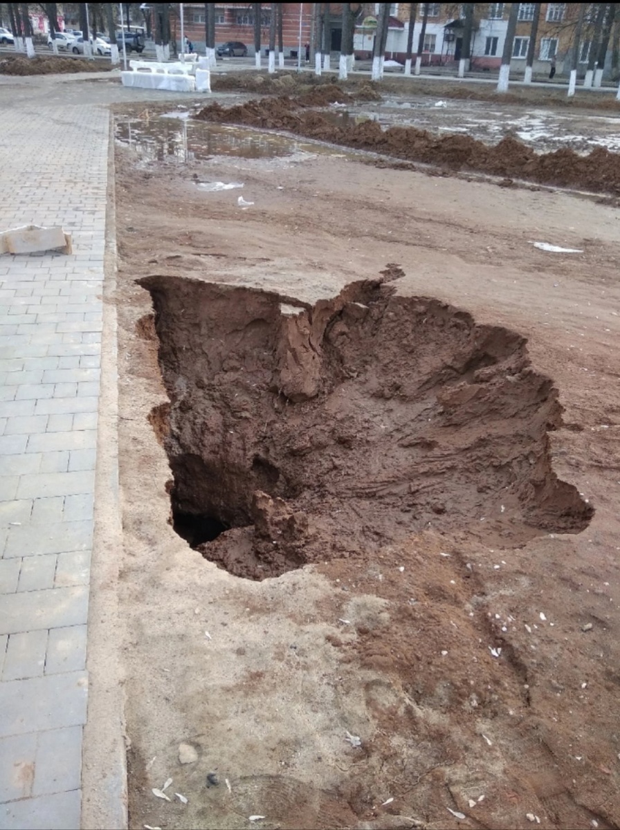 Год назад на том месте где сейчас пошла волной брусчатка там яма была, песочком присыпали