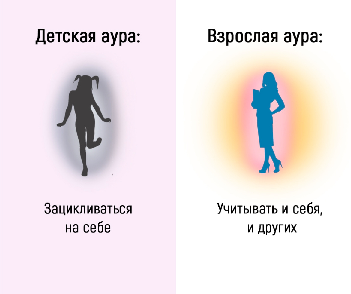 Все мы когда-то были детьми. Мир ребенка часто вращается вокруг него самого. "Я хочу", "дай мне", "это моё" – такие фразы нередко можно услышать от малышей. На картинке слева это состояние очень точно подмечено: силуэт ребенка словно заключен в кокон, а подпись гласит: "Зацикливаться на себе". Это не плохо и не хорошо – это естественный этап развития. Ребенок познает себя и свои потребности, учится взаимодействовать с миром через призму собственного "Я". Но время идет, мы растем и становимся взрослыми. И вместе с этим меняется наше восприятие мира. Мы начинаем понимать, что вокруг есть другие люди, у которых тоже есть свои желания, чувства и потребности. Взросление – это не только про увеличение возраста, это про расширение взгляда на мир, про умение видеть не только себя, но и тех, кто рядом. На картинке справа мы видим силуэт взрослого человека, окруженного сиянием, которое словно выходит за его пределы и взаимодействует с окружающим пространством. Подпись гласит: "Учитывать и себя