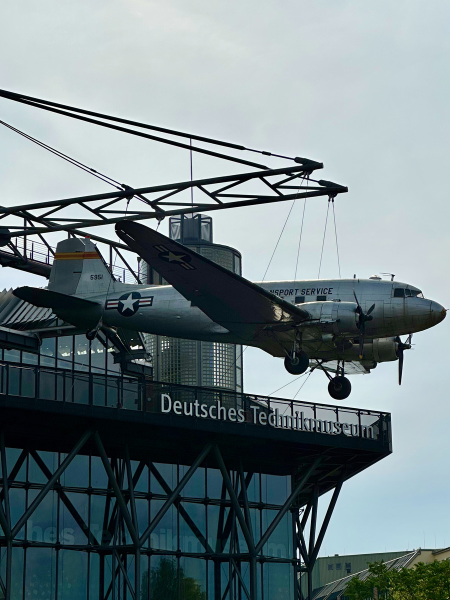 Над входом в немецкий технический музей весьма эффектно подвешен Douglas DC-3 - один из «изюмных бомбардировщиков». Такое название получили самолёты союзников, снабжавшие продовольствием и другими предметами первой необходимости западные секторы Берлина по берлинскому воздушному мосту во время блокады Западного Берлина в 1949 году. «Изюмными» они стали после того, как по собственной инициативе американские экипажи перед посадкой на аэродром Темпельхоф стали сбрасывать берлинским детям небольшие пакеты со сладостями на самодельных маленьких парашютиках. В этих пакетиках чаще всего был шоколад и жевательная резинка и, предположительно, изюм.