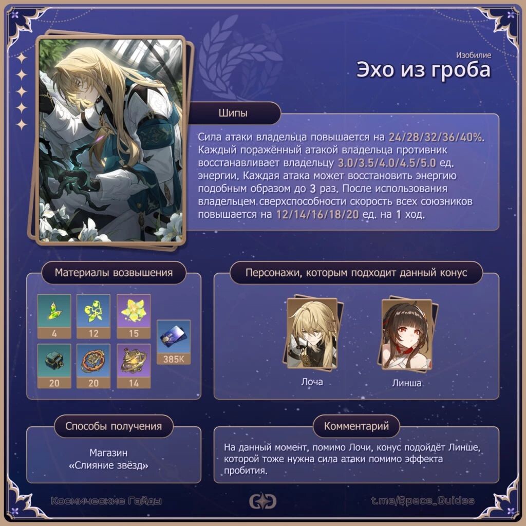 ㅤ«Эхо из гроба» — сигнатурный Световой конус Лочи, персонажа Пути Изобилия. В версии 3.2 и последующих этого персонажа и его конус, наряду с другими, попавшими в селектор проигрышей, можно приобрести в новом магазине «Слияние звёзд» за специальные предметы. Стоит ли тратить их для получения данного конуса? С помощью этой статьи вы сможете взвесить все «за» и «против»! ㅤ«Эхо из гроба» — сигнатурный Световой конус Лочи. ㅤС подробным описанием пассивного таланта и необходимыми материалами можно ознакомиться на картинке: ㅤПовышает силу атаки владельца на 24/28/32/36/40%. При атаке владельцем противника восстанавливает 3.0/3.5/4.0/4.5/5.0 единиц энергии, таким образом можно восстановить энергию до трёх раз. Применение сверхспособности на 1 ход повышает скорость всех союзников на 12/14/16/18/20 единиц. ㅤСветовой конус «Эхо из гроба» можно получить в специализированном магазине «Слияние звёзд» за четыре осколка Светового конуса. ㅤЕго также можно получить с рераном самого Лочи, в отдельном иве
