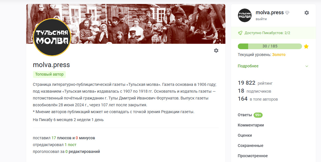 Канал «Тульской молвы» на сайте Пикабу получил статус топового автора!