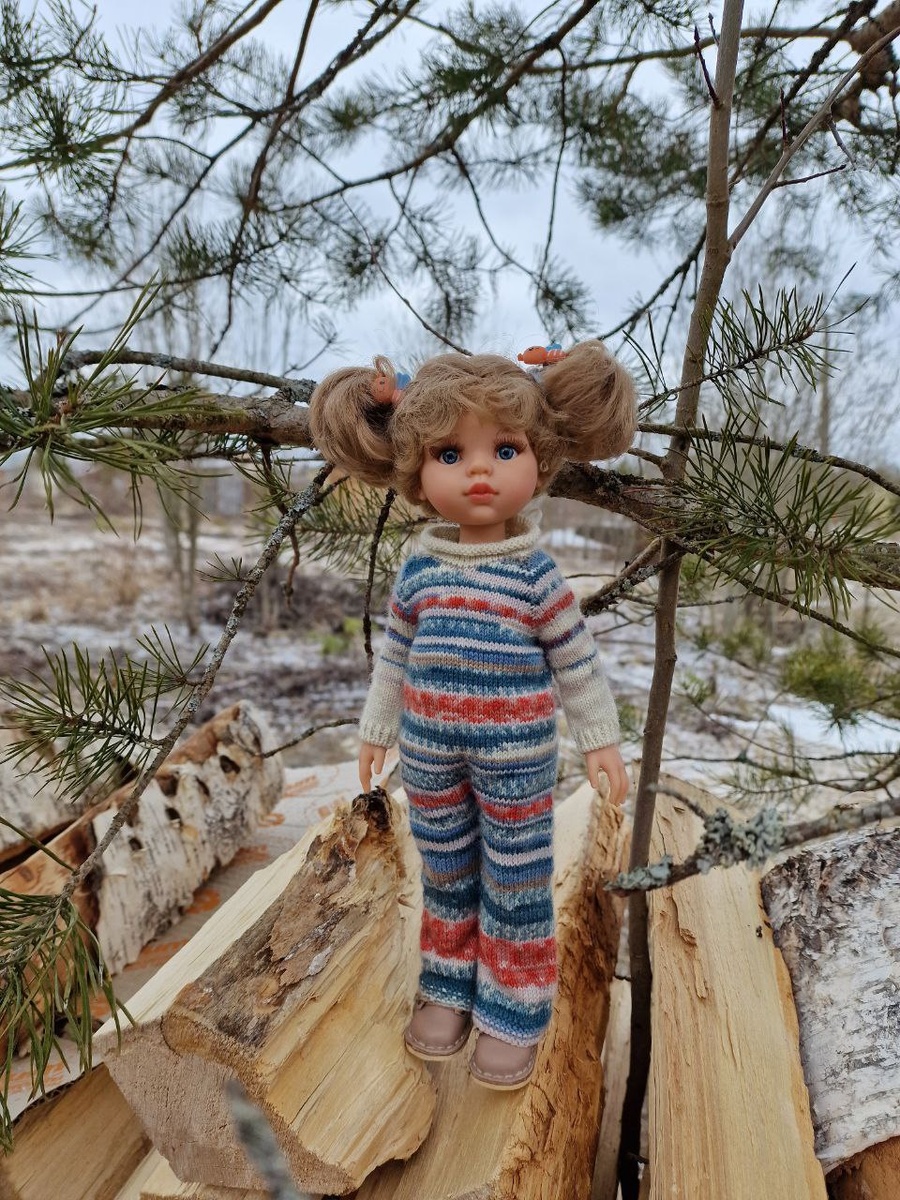 Прогулка на дачном участке. Пока холодно, поэтому в тёплом комбинезоне из Регины от Сеам. Оды носочной пряже я уже спела, но попробовав Регину, понимаю, что от ценового сегмента сильно зависит качество. Сейчас вяжу из Форзы от Ярн Арт и вижу разницу. Нитка более рыхлая, какая-то ватная. Регина плотная, жёсткая. Для кукольного вязания мне очень нравится. Но в недорогом сегменте больше вариантов расцветок. Причём именно тех, которые нужны куклам. Возможно, разорюсь на Регию и Опал. Очень хочется.