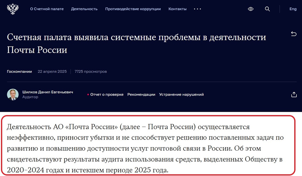 Деятельность АО «Почта России» (далее – Почта России) осуществляется неэффективно, приносит убытки и не способствует решению поставленных задач по развитию и повышению доступности услуг почтовой связи в России. Это следует из результатов аудита использования средств, выделенных обществу в 2020–2024 гг. и I квартале 2025 г.