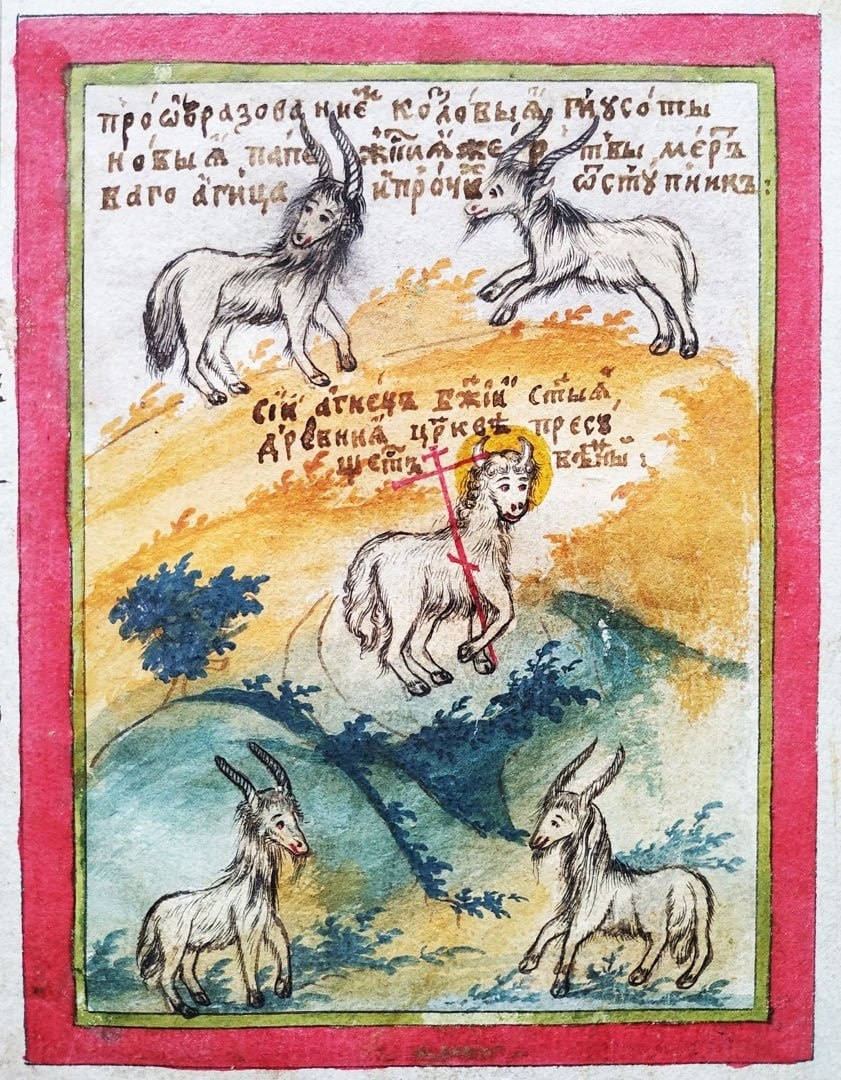 Агнец и козлы В старообрядческом сборнике нач. XIX века изображен евхаристический агнец древней Церкви - образ крестной жертвы Христа. По сторонам от него «козловыя гнусоты» новой, «папской» евхаристии.