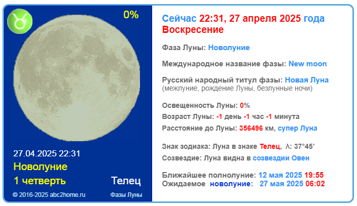 29 апреля 2025 04:52 (вт) 27 апреля 2025 22:31 MSK - начало лунного месяца, знаки зодиака - до 27 апреля 2025 10:16 Луна в знаке Овна, затем в знаке Тельца. http://www.abc2home.ru/lunnyj_calendar/2025/fazy-luny.html