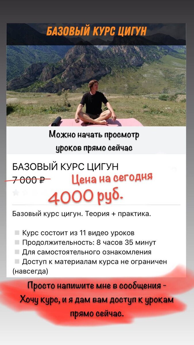 Небольшой воскресный цигун-подарок! БАЗОВЫЙ КУРС ЦИГУН ⚠️Рекомендую просматривать только один урок в день и выполнять самостоятельную практику. Для наилучшего результата желательно просматривать уроки в течении 11 дней без перерыва, так как в ходе практики идет накопительный эффект. ✅Чтобы получить доступ к видеоурокам цигун прямо сейчас со скидкой 3000₽ Просто напишите мне в сообщения - Хочу курс. @AndreyBegishev ☎️Или Вотсап: +79225155292 И я сам лично дам вам ссылку на вступление в закрытый телеграм канал с уроками.