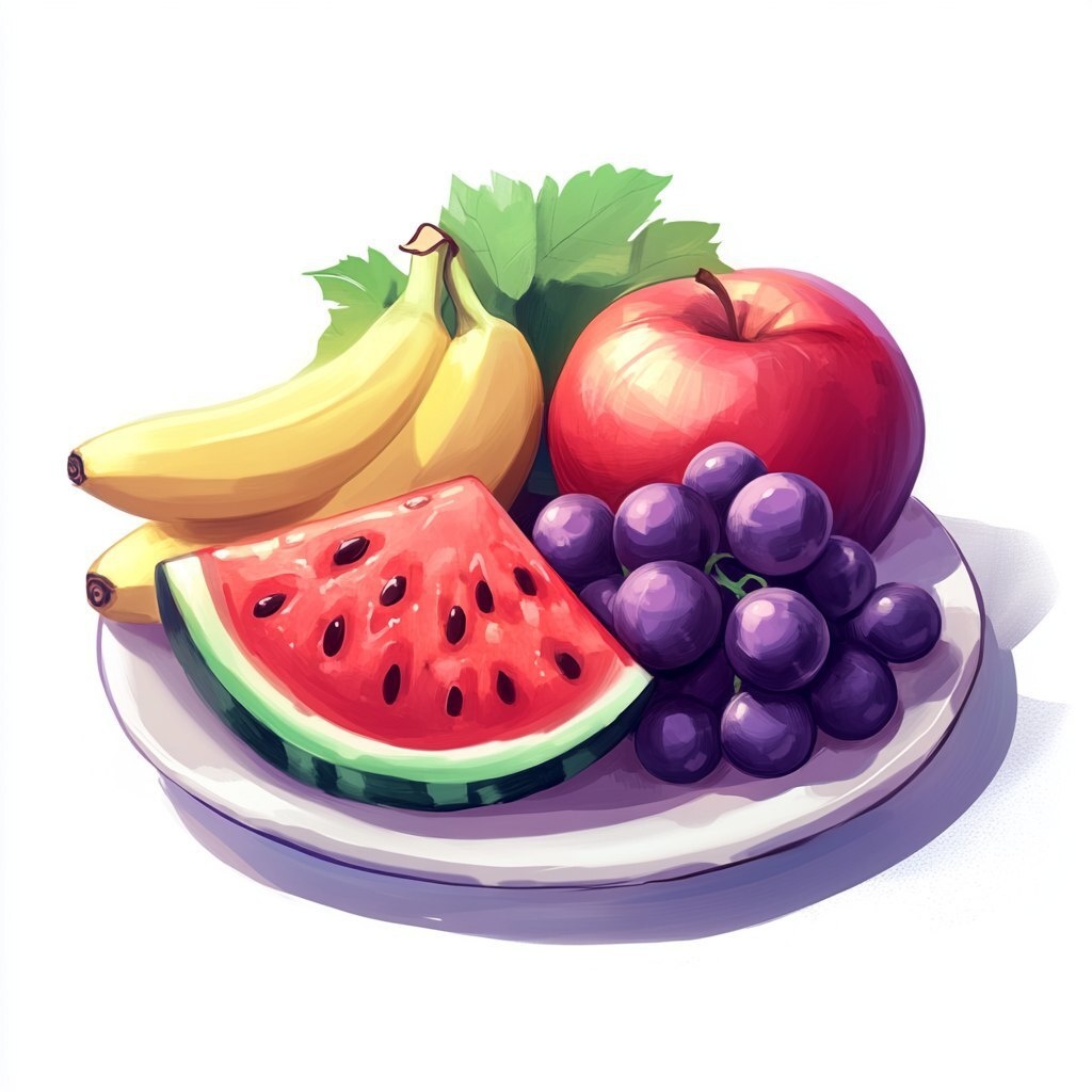 Создано на основе запроса: Anime-style illustration of a small fruit plate with a few slices of juicy watermelon, a peeled banana, a bunch of purple grapes, and a shiny red apple. The colors are vibrant and fresh, with soft highlights to make them look delicious. The background is pure white, with a soft shadow to ground the fruits. --- Автоперевод: Иллюстрация в стиле аниме небольшой фруктовой тарелки с несколькими кусочками сочного арбуза, очищенного банана, куча фиолетового винограда и блестящего красного яблока. Как тебе изображение? 🤔 https://dzen.ru/id/65c0c65c86e4f837c27b24d7 #ИИ #AI #нейросеть #midjourney #art