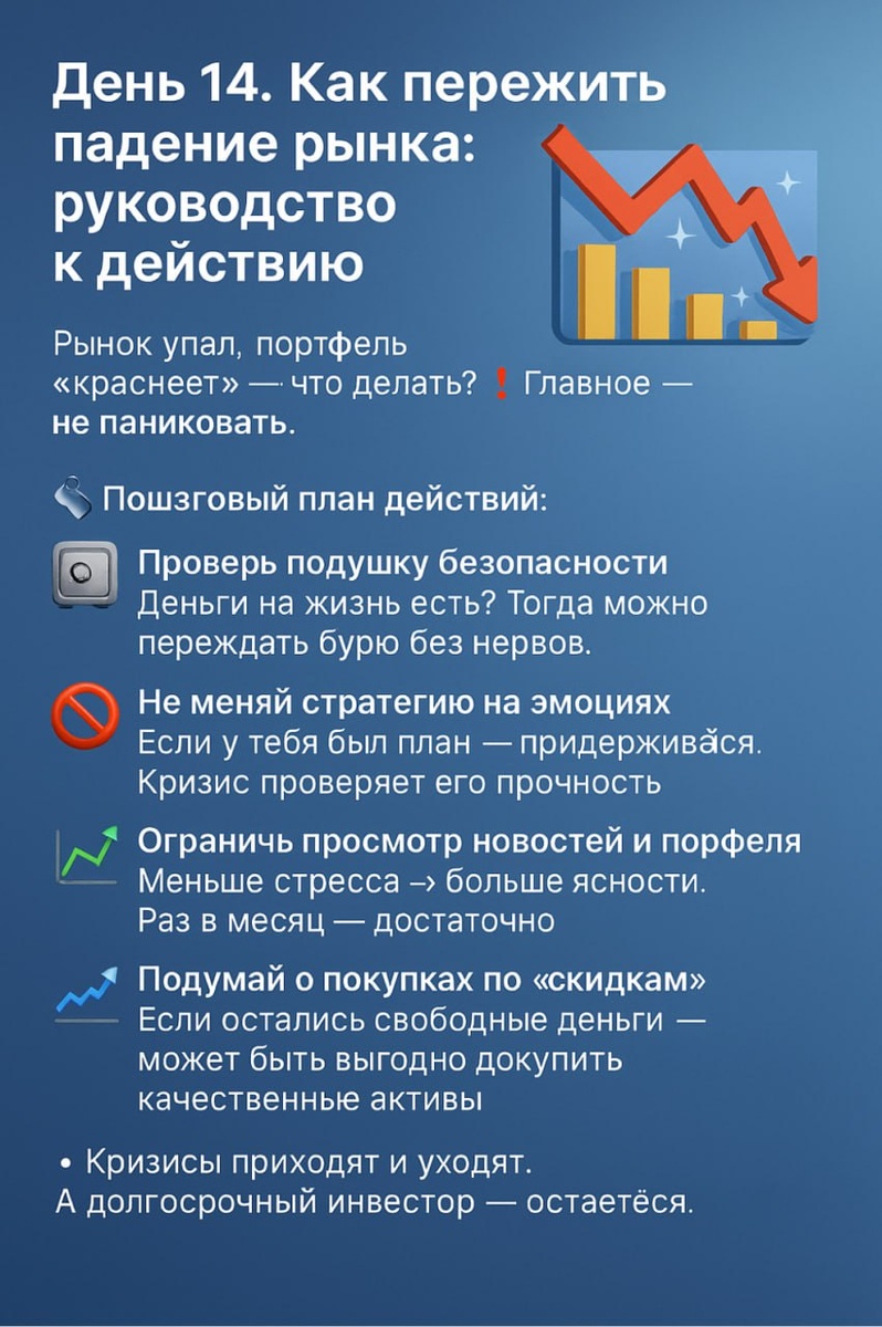 📆 День 14. Как пережить падение рынка: руководство к действию Рынок упал, портфель “краснеет” — что делать? ❗️ Главное — не паниковать. 🧭 Пошаговый план действий: Проверь подушку безопасности Деньги на жизнь есть? Тогда можно переждать бурю без нервов. Не меняй стратегию на эмоциях Если у тебя был план — придерживайся. Кризис проверяет его прочность. Ограничь просмотр новостей и портфеля Меньше стресса → больше ясности. Раз в месяц — достаточно. Подумай о покупках по “скидкам” Если остались свободные деньги — может быть выгодно докупить качественные активы. Анализируй, а не паникуй Какие активы просели сильнее всего? Что можно скорректировать на будущее? 💬 Кризисы приходят и уходят. А долгосрочный инвестор — остаётся. 📌 Помни: не продавай на страхе. История показывает: рынок всегда восстанавливался. #день 14 #100днейинвестора Ваша благодарность , поделиться постом