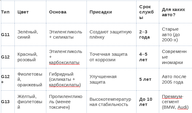 ✔ Основные типы антифризов (G11, G12, G12+, G13) — в чём разница?