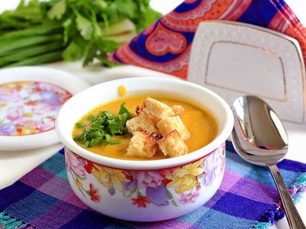 Суп-пюре из кабачков с сухариками🍲 Иногда на смену сытным супам и борщам приходят нежные малокалорийные супы-пюре. Это разгрузка для организма и неплохо для разнообразия. 🍃🍃🍃🍃🍃 • Кабачок - 1 шт. • Морковь - 1 шт. • Лук репчатый - 0.5 шт. • Картофель - 1 маленький • Чеснок - 1 зубчик • Масло растительное - 1 ст.л. • Зелень - для подачи • Хлеб для сухариков - 2-3 ломтика 🍃🍃🍃🍃🍃🍃🍃🍃 • Овощи нарезать произвольными кусочками. Чем мельче, тем быстрее приготовится суп. • В кастрюльке разогреть растительное масло и добавить лук с чесноком. Довести их при помешивании до прозрачности. На это уйдет пара минут. • Добавить морковь и еще подержать на огне пару минут. • Далее положить оставшиеся овощи, несколько раз перемешать, посолить. Можно добавить любимые специи и приправы. Я не добавляла. • Содержимое кастрюли залить водой, чтобы она покрыла овощи. Довести до кипения и варить под крышкой до готовности и мягкости картофеля. • Тем временем подготовить сухарики. Это можно сделать любы