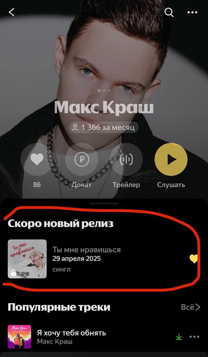 У моего сына Макс Краш 29 апреля выходит новый релиз и сегодня и завтра целый день будет посвящен этому) Подготовила для вас три поста с пользой, которые выпущу в течение дня, а с вас при желании Пресейв. Начинаем. Первое. Знаете ли вы, что до выхода трека в мобильной версии Яндекс музыки можно оформить уведомление "Скоро новый релиз"? Что это дает? Слушатели, которые заходят в карточку артиста увидят дату нового релиза, название, обложку и уже смогут поставить лайк, чтобы предсохронить трек, даже не всегда догадываясь, что предсохроняют. Чаще всего рука сама тянется к сердечку и страшное слово ПРЕСЕЙВ не пугает, так как тут его нет, а есть только ❤️
