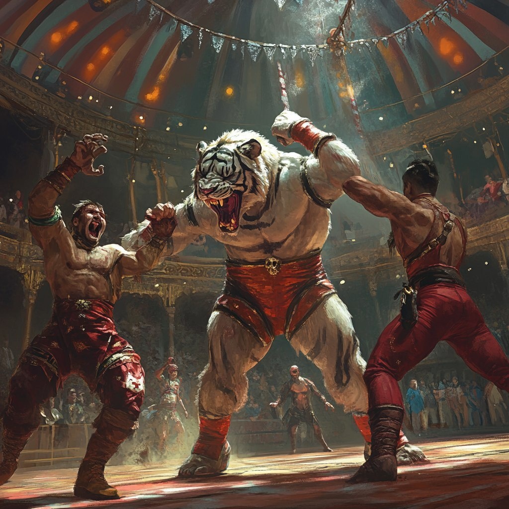 Создано на основе запроса: circus fighting game cover art --- Автоперевод: Цирковая файтинга обложка Интересно выглядит? 🤔 https://dzen.ru/id/65c0c65c86e4f837c27b24d7 #ИИ #AI #нейросеть #midjourney #art