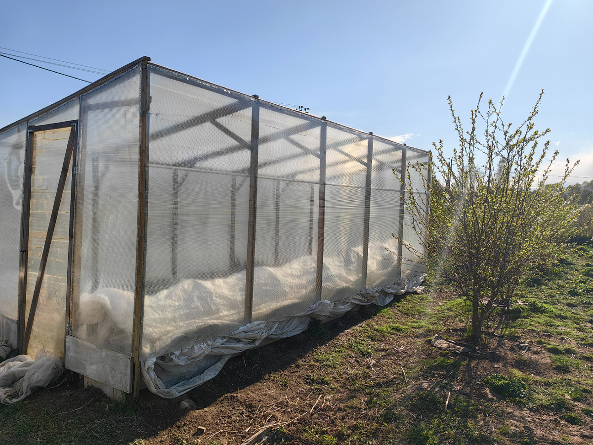 Ну, друзья, каждый день нам обещают до -5 ночью, но пока что ниже 0 не опускалась температура. Сегодня +6 и весь день идет снег, не поверите))) Сыплется трухой то густо стеной, то отдельными хлопьями и тут же все тает на солнце. Погода очень переменчивая, то темнеет и пасмурно, то солнце шпарит))) Мы перенесли из парника баклажаны и перцы домой, все уже высаженные томаты и рассаду в ящиках укрыли под дугами тремя слоями спанбонда. Заткнули все дыры в основании и прикрутили поликарбонат к окну, которое у нас во всю шестиметровую стену обычно открыто весь сезон. Хорошо, что пока только одна грядка была высажена, возни с укрытием меньше. Да и в поликарбонатном парнике теплее, чем в пленочной теплице. Я пришла проверить как они две ночи перенесли с нудевой температурой. У меня на перемены погоды состояние не стояния, так что я за два дня впервые их пришла посмотреть. Отогнула спанбонд, а на меня тут же вытаращились санберри)))) Все себя чувствуют прекрасно, бодры, веселы, спрашивают, что