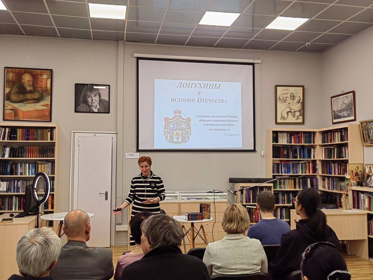 26 апреля в библиотеке №180 им. Н.Ф. Фёдорова состоялась Библионочь — ежегодная Всероссийская акция. Тема Библионочи в 2025 году — «Свои герои». Спасибо за приглашение. Тема моего доклада вызвала неподдельный интерес слушателей. Популярность генеалогии растет. Мой доклад иллюстрация к проекту Института культурного и природного наследия им. Д.С. Лихачева. «Живое наследие памяти». Лопухины представители знаменитого княжеского и дворянского рода, среди которого были государственные деятели, военачальники, предводители дворянства, высшие чины Российской империи, генералы и адмиралы, стрелецкие головы и полковники, земские деятели, благотворители, меценаты, храмоздатели, просветители, преподаватели, поэты, публицисты и переводчики, мемуаристы, коллекционеры. Жизнь многих из них нередко была связана с наукой, художественным и музыкальным творчеством. Будучи на разных поприщах, они способствовали укреплению духовного и культурного пространства Русского мира. Мой рассказ о семье, о