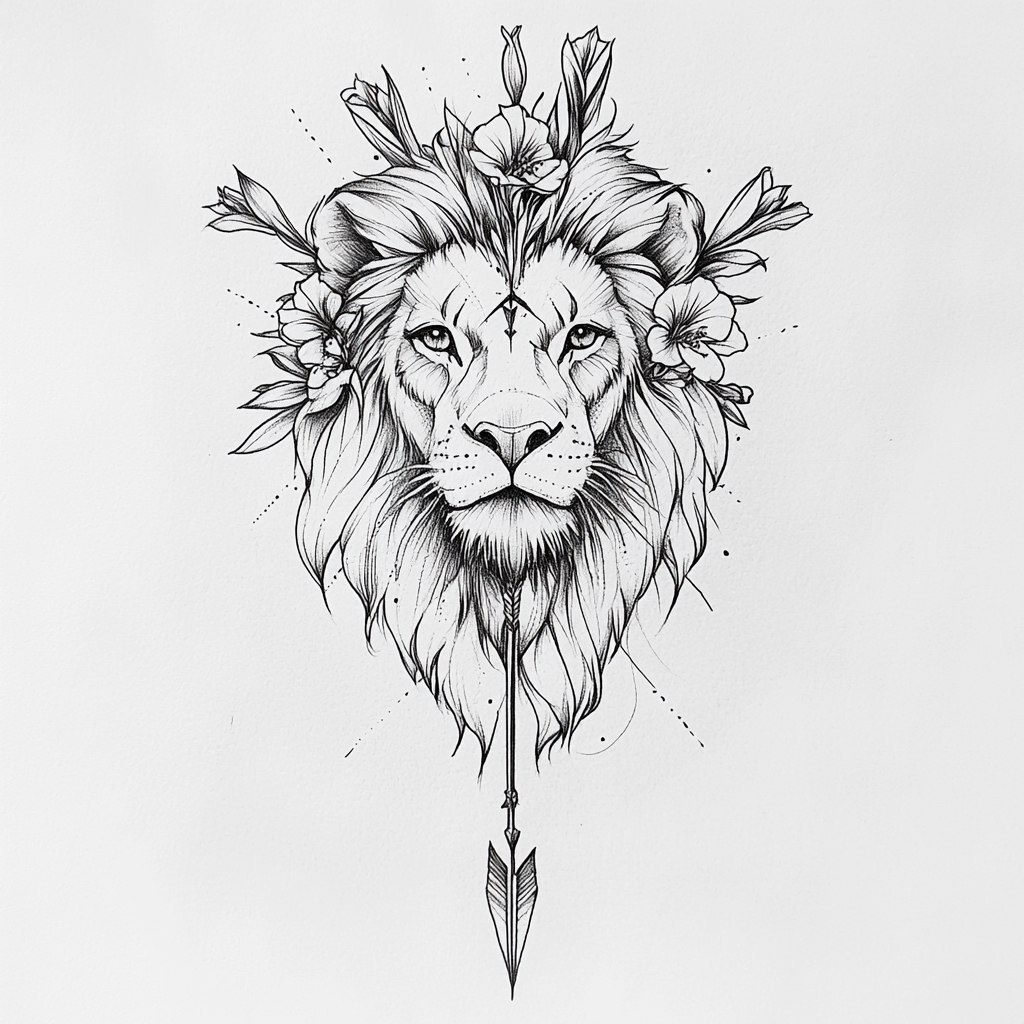 Создано на основе запроса: drawing of a minimalist lion's head crossed by an arrow and in the mane of gladiolus flowers for a tattoo