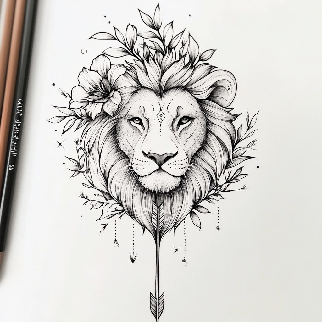 Создано на основе запроса: drawing of a minimalist lion's head crossed by an arrow with pretty details and in the mane of gladiolus and