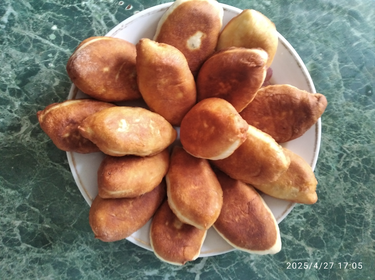 Через час тесто разрезать на 16 частей, раскатать или просто размять руками в лепёшки и разложив фарш защипнуть пирожки. Пирожки закрыть полотенцем для подъёма. Примерно через час пирожки увеличатся в 2 раза и можно ставить сковороду на плиту, налив в неё растительное масло.