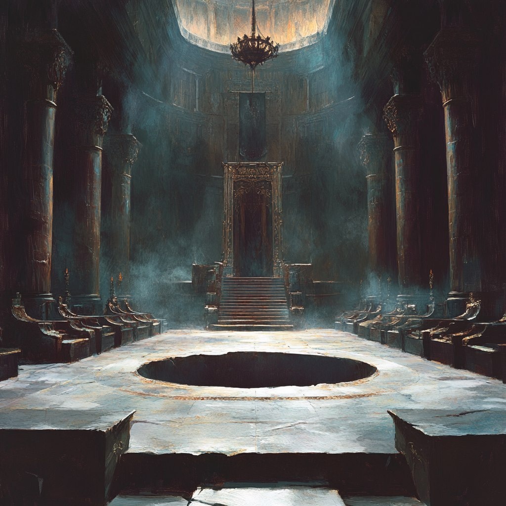 Создано на основе запроса: a royal throne room with a large empty pit in the middle of the floor, painting in the style of Frank Frazetta