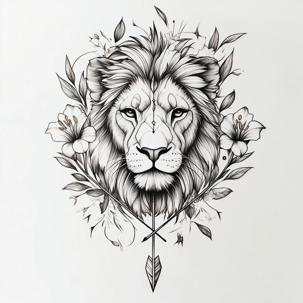 Создано на основе запроса: drawing of a minimalist lion's head crossed by an arrow with pretty details and in the mane gladiolus