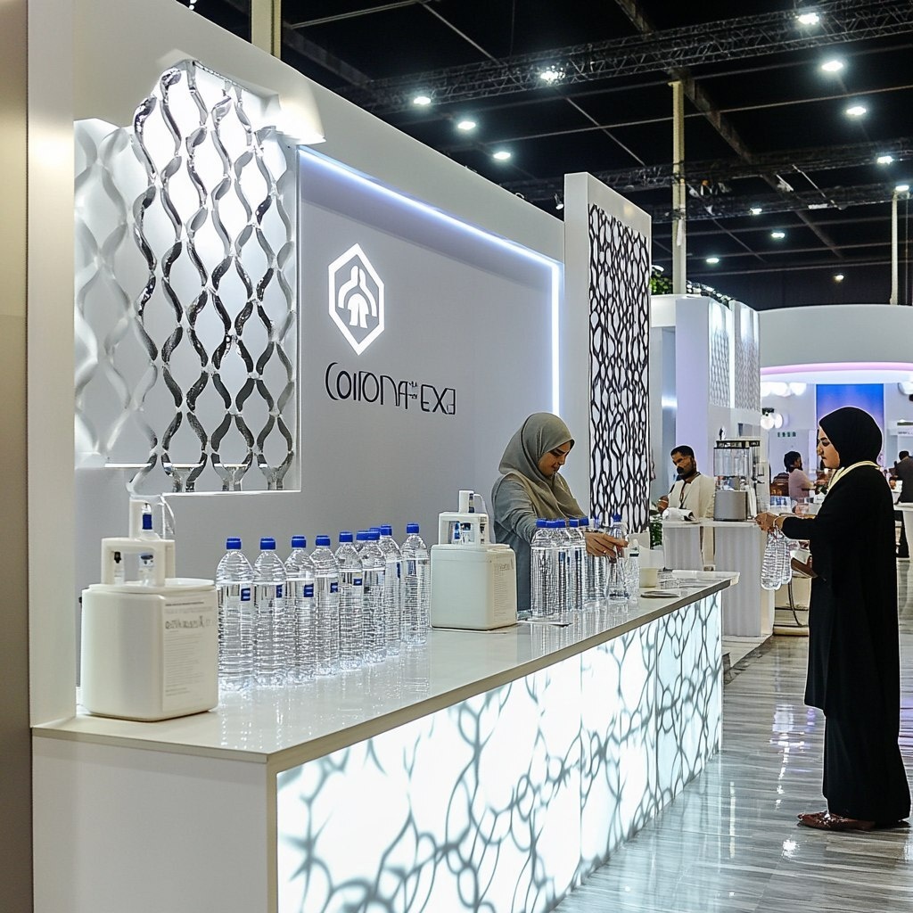 Создано на основе запроса: A stylish water station in a modern exhibition hall, branded with sponsor’s logo, clean water dispensers with