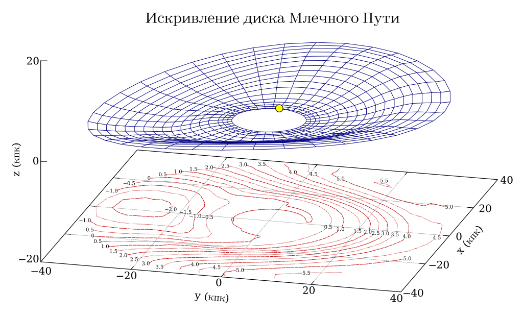 Пусть правая сторона диска галактики лежит выше плоскости орбиты галактики. Тогда первое слагаемое в формуле (5) для встречного вращения галактики дает эффект темной материи, а для попутного вращения увеличивает центробежное ускорение. Второе слагаемое в формуле (5) для встречного вращения галактики вызывает изгиб правой половины диска галактики вверх, а левой половины – вниз (изгиб диска обратный S – форме), а для попутного вращения галактики вызывает изгиб правой половины диска вниз, а левой половины – вверх (S – форма изгиба диска). Величина эффекта пропорциональна скорости вращения диска галактики и поэтому максимальна на краю диска. Первое слагаемое в формуле (6) вызывает изгиб правой половины диска галактики вниз, а левой половины – вверх, уменьшая эффект от силы Кориолиса для встречного вращения и увеличивая эффект для попутного вращения. Величина эффекта пропорциональна расстоянию от центра галактики и поэтому максимальна на краю диска. Второе слагаемое в формуле (6) вызывает сжатие диска по радиусу слева и справа, приводя к асимметрии диска. Эффект одинаков для обоих направлений вращения галактики, так как от скорости не зависит. В Википедии приведена форма деформации диска Млечного Пути, которая хорошо согласуется с приведенными выше рассуждениями для вращения Галактики против часовой стрелки по орбите, по часовой стрелке вокруг своей оси и наклоном оси вращения Галактики влево от вектора угловой скорости.