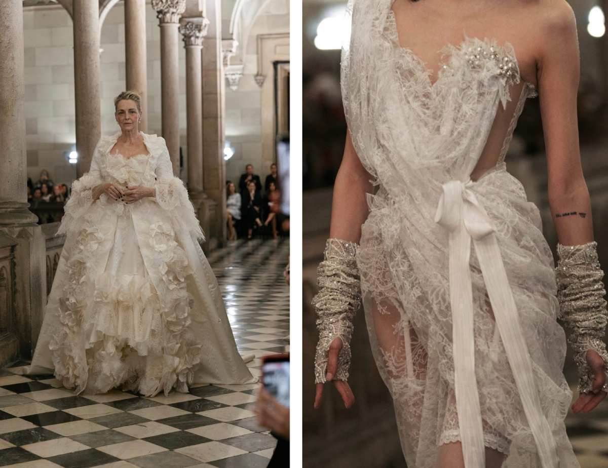 На неделе свадебной моде в Барселоне прошел невероятный, роскошный показ Vivienne Westwood 2026. Мы еще раз убедились, что Vivienne Westwood - это королева исторического костюма, ее коллекции до сих пор отражают основную идею и концепцию бренда. Больше всего нас удивил образ в стиле королевы Марии - Антуанетты с рюшами и акцентным кружевом. Бренд Vivienne Westwood создает просто умопомрачительные корсеты, которые вдохновляют невест по всему миру. Ни одна свадебная коллекция не обходится без этой деликатной детали. Акцентные серьги в стиле "пшеницы", которые также возвращают нас к роскошным историческим украшениям, но только в новом дерзком воплощении. Вспоминаем знаменитые короны с колосьями пшеницы и броши, которые хранятся в музеях и сокровищницах королевских семей. Еще больше кружева, драпировки, цветов и жемчуга. Цветам в этой коллекции бренд уделил особое внимание: легкие цветочные принты , объемные 3-d кружева и высокие ободки из роз. Для консервативных невест в к