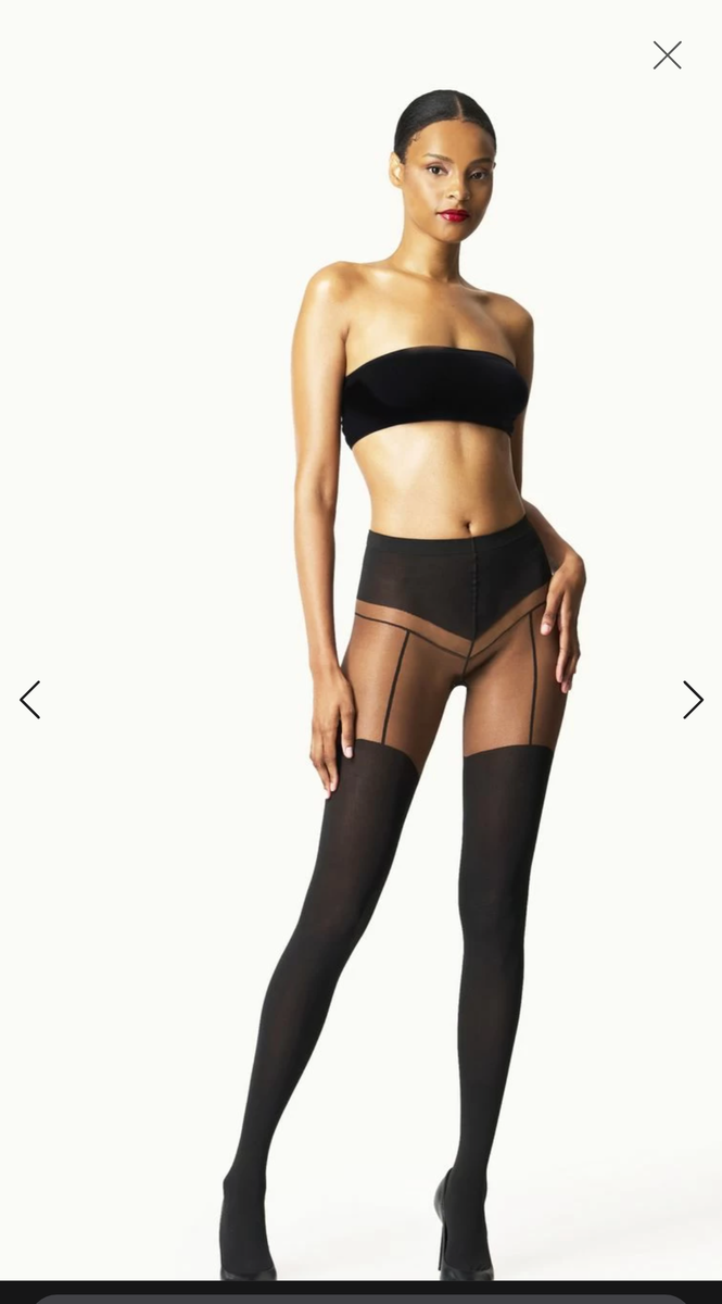 Колготки с изюминкой: контрастные вставки создают эффект кружевных подвязок и чулок — как будто ты примерила немного ретро-флирта, но без перебора. Круговая вязка должна сидеть как влитая, мягко подчеркивая ноги, а широкий эластичный пояс не будет скользить и давить. У Wolford- это фирменная фишка. Идеально для вечернего образа: добавляют образу игривости, но выглядят сдержанно и элегантно.